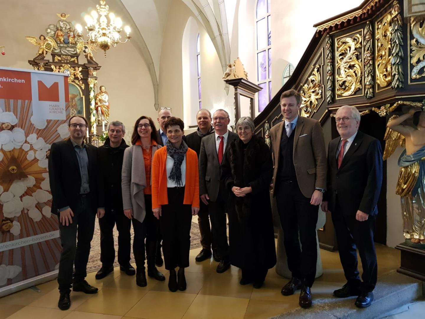 v.l.n.r.: Michael Kolb Projektleiter tmt, Michael Thein Pilgerbegleiter, Jutta Geyrhalter LEADER Projektmanagerin, David Sünderhauf Fotograf, Ute Steininger LEADER Projektassistenz, Dekan Thomas Guba Verein Markgrafenkirchen e.V., Hans Peetz Projektstelle Markgrafenkirchen, Dr. Dorothea Greiner Regionalbischöfin, Dr. Oliver Bär Landrat Hof, Dekan Günter Saalfrank Hof
