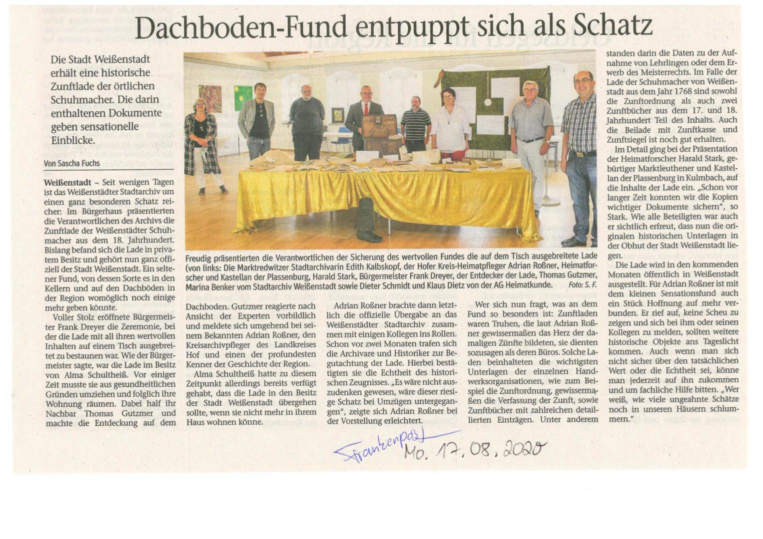 Bei der Übergabe der historischen Schuster-Zunftlade handelt es sich nicht um einen überraschenden Fund auf dem Dachboden. Vielmehr wurde dieser Schatz der Weißenstädter Stadtgeschichte über viele Jahre durch eine verantwortungsvolle Bürgerin der Stadt Weißenstadt sicher aufbewahrt.