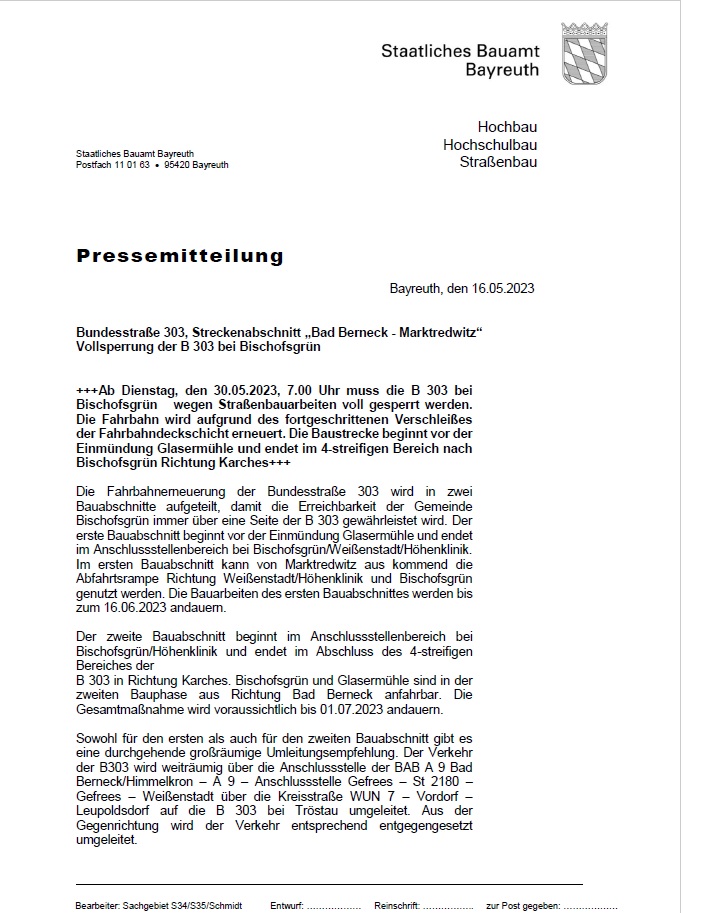 Start » Aktuelles » Vollsperrung der Bundesstraße 303 bei Bischofsgrün Vollsperrung der Bundesstraße 303 bei Bischofsgrün Verfasst am 17. Mai 2023 Ab Dienstag, 30.05.2023 muss die B303 bei Bischofsgrün wegen Straßenbauarbeiten voll gesperrt werden. Zurück