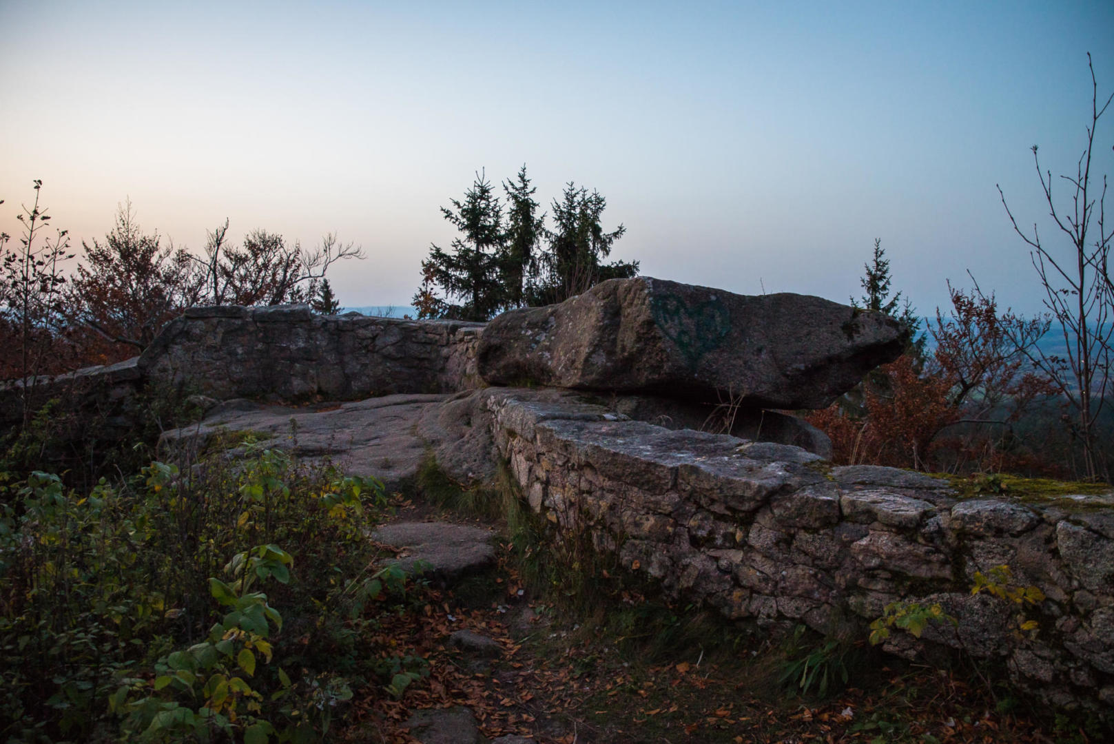 Vor der Burgpforte ein mächtiger, nach oben sich erweiternder Felsblock mit ovaler Platte, der sagenumwobene Teufelstisch. Nach der Sage spiel(t)en die Teufel hier ihr wildes Kartenspiel.