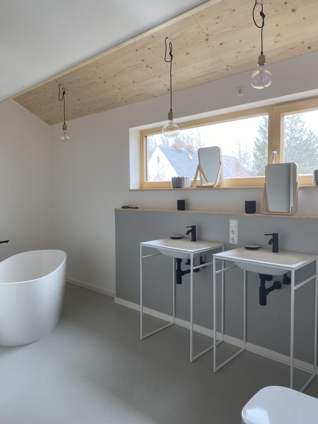 - großes Bad mit freistehender Badewanne, Regendusche und zwei Waschbecken (Handtücher und Naturkosmetik im Preis enthalten)