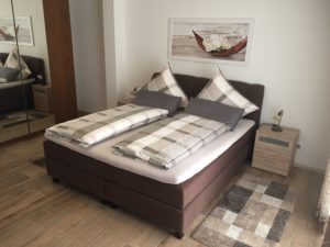 Ceran-Kochfeld und Backröhre, Kühlschrank mit Gefrierfach, Filterkaffeemaschine, Wasserkocher, Toaster, Mikrowelle. Schlafzimmer mit Doppelbett (Boxspringbett), Zustellliege für Kind möglich. Das Badezimmer ist mit einer großen, barrierefreien Dusche, Wand-WC und Wand-Bidet ausgestattet. Bettwäsche, Hand- und