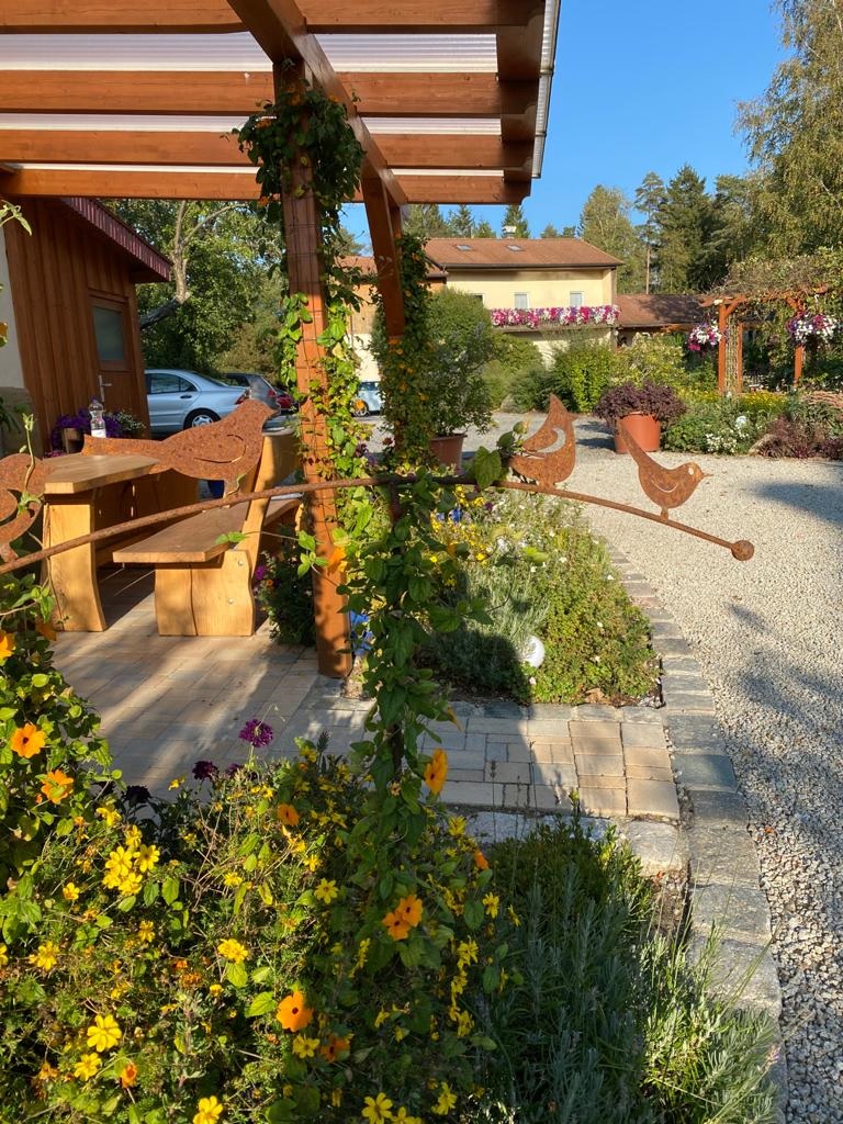 Unser großzügiges Grundstück allein bietet vielfältige Entspannungsbereiche an – sei es auf der blumenumrankten, überdachten Terrasse, am gepflegten Seerosenteich oder am angrenzenden Alpakagehege der Familie Grießhammer.