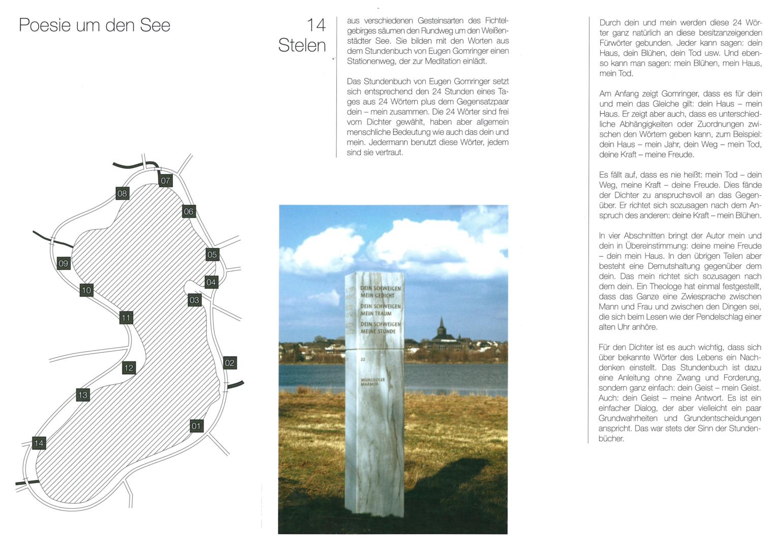 14 Stelen aus verschiedenen Gesteinsarten des Fichtelgebirges säumen den Rundweg um den Weißenstädter See. Sie bilden einen Stationenweg mit Auszügen aus dem Stundenbuch von Eugen Gomringer.