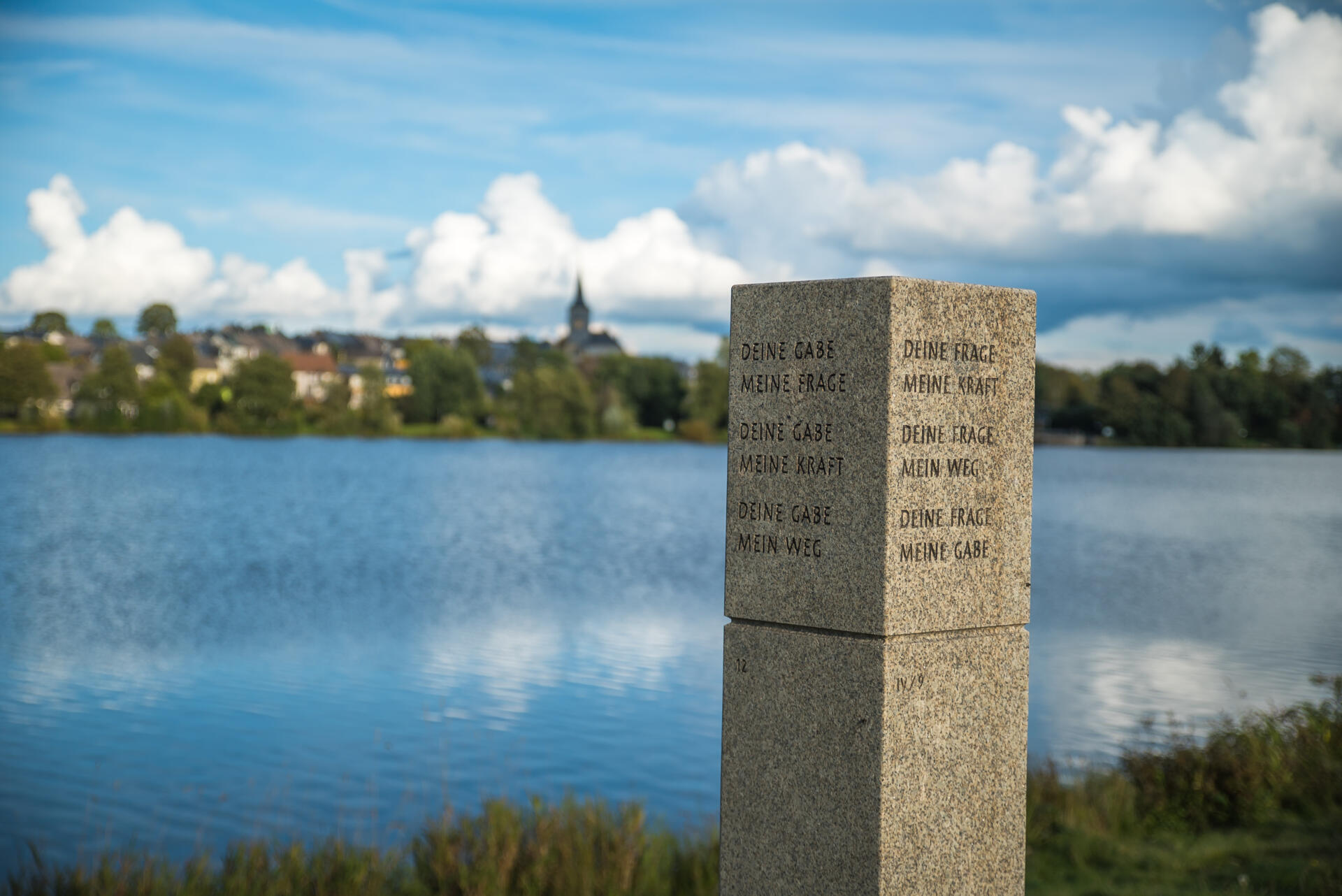 Die Texte des Stundenbuches sind auf 14 Granitstelen eingemeißelt, die den Poesiepfad um den Weißenstädter See bilden.