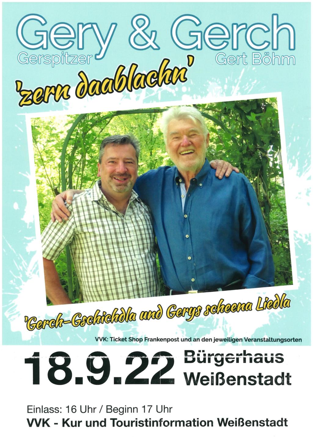 Die beiden befreundeten Männer wollen mit ihrem neuen Programm „Zern Daablachn“ dem Publikum mit Böhms verschmitzten oder brüllend komischen „Gerch“-Gschichdla, die seit über 50 Jahren jedes Wochenende in der Frankenpost erscheinen, und mit frechen Liedla des Gitarristen Gery Gerspitzer zweieinhalb vergnügliche Stunden bereiten.