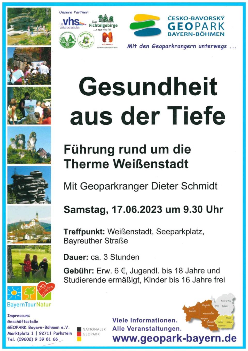 Im weiteren Sinne sind Mineralien, Radon und heißes Wasser Grundlage für das junge Kurwesen in Weißenstadt. Was hat es mit diesen Bodenschätzen auf sich, wie setzt man sie medizinisch ein, was bewirken sie? Antworten dazu und vieles weitere Wissenswerte mehr gibt es auf einem Rundgang von der Radonquelle über die Therme Siebenquell zum Kurzentrum mit Dieter Schmidt. Kostproben des Radonheilwassers inklusive
