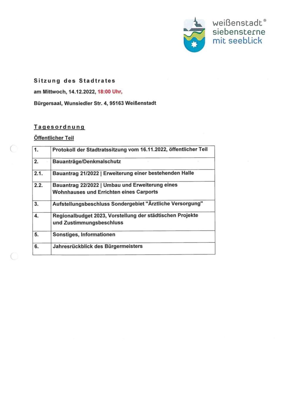 Die Sitzungen des Stadtrates von Weißenstadt finden regelmäßig im Bürgersaal statt. Für den öffentlichen Teil der Sitzung sind Besucher/innen herzlich willkommen.