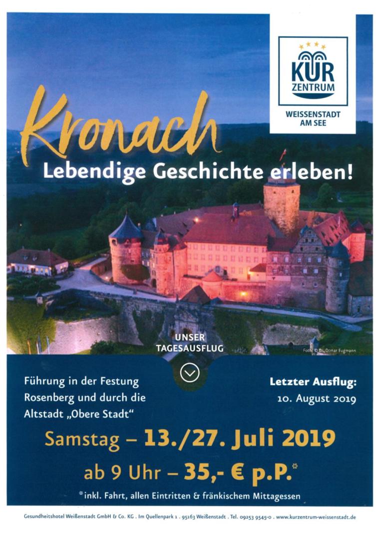 * Abfahrt 09:00 Uhr vor dem Haupteingang des Kurzentrum Weißenstadt, Ankunft wieder im Hotel ca. 18:00 Uhr