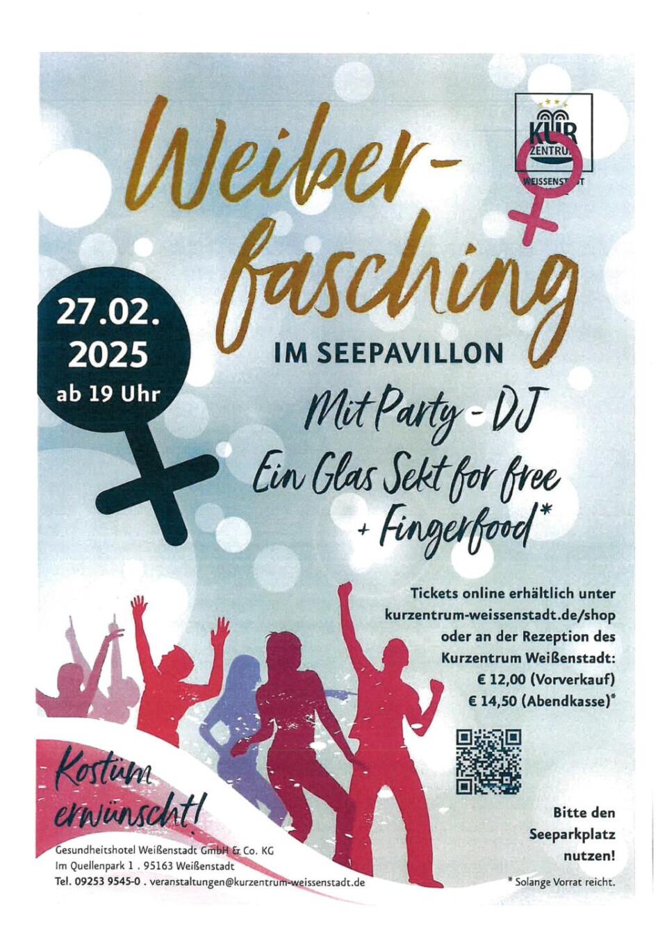 Weiberfasching im Seepavillon – Kurzentrum 27.02.2025 • 19:00 Uhr Kurzentrum Weißenstadt - Im Quellenpark 1, 95163 Weißenstadt Veranstaltungen im Kurzentrum