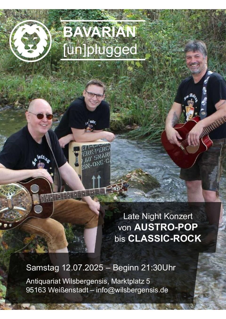 Aber…. lasst Euch durch die Lederhosen nicht täuschen, das ist dem Bayerischen Bandnamen geschuldet. Unser Motto ist -von Klassik Rock bis Austro Pop-, das Ganze „gewürzt“ mit eigenen Songs in fränkisch/oberbayerischer Mundart und eben überwiegend mit akustischen Instrumenten gespielt.