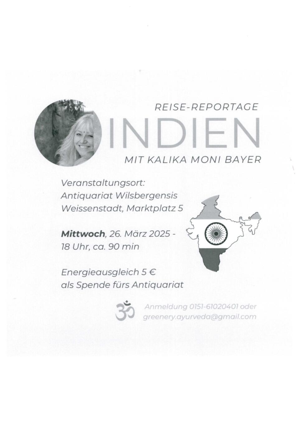 Reise-Reportage INDIEN mit Kalika Moni Bayer 26.03.2025 • 18:00 – 20:00 Uhr Anmeldung bitte unter: 0151 / 61020401 Reise-Reportage INDIEN mit Kalika Moni Bayer Wilsbergensis